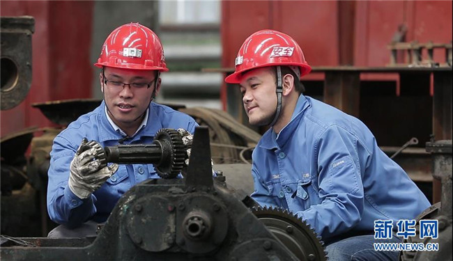 全國人大代表、山西焦煤西山煤電杜兒坪煤礦的董林(左)為職工講解設(shè)備構(gòu)造和傳動原理(2018年4月25日攝)。新華社發(fā)