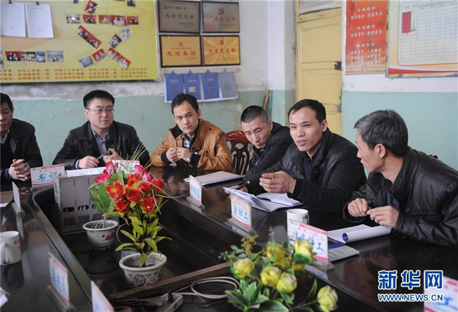 全國人大代表、山西焦煤西山煤電杜兒坪煤礦的董林(右二)在和工友們座談(2013年2月26日攝)。新華社記者 燕雁 攝