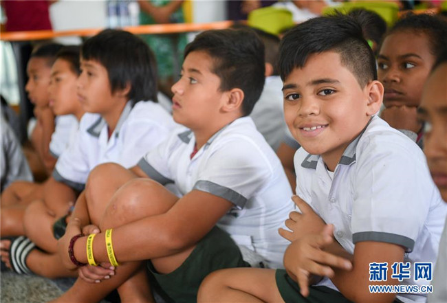 10月26日,在庫克群島首都阿瓦魯阿的阿皮尼考學(xué)校,小學(xué)生欣賞中國交響樂團(tuán)演奏家的表演。