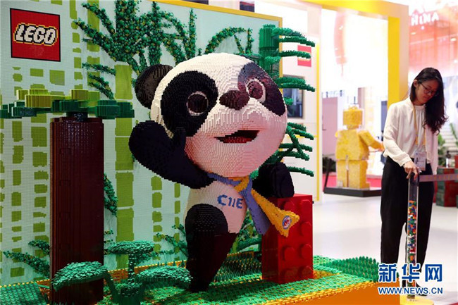 11月3日,在品質(zhì)生活展區(qū)的樂高展臺(tái),用積木搭成的進(jìn)博會(huì)吉祥物熊貓“進(jìn)寶”已安裝就緒。新華社記者劉穎攝