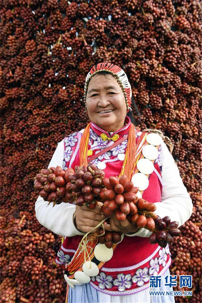 11月2日,云南福貢縣鹿馬登鄉(xiāng)干布村的傈僳族老人妮四菊站在豐收的草果前。新華社記者 楊宗友 攝