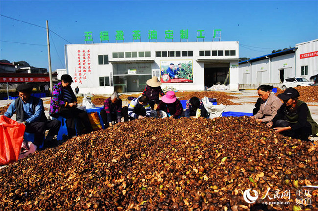 1月3日,在重慶市酉陽(yáng)土家族苗族自治縣五福鎮(zhèn)的五福盈茶油定制工廠,工人們正忙著晾曬油茶籽,整個(gè)廠區(qū)一片繁忙景象。近年來(lái),該縣采取“生態(tài)+產(chǎn)業(yè)”模式在荒山上開(kāi)發(fā)的上萬(wàn)畝油茶已陸續(xù)豐收,油茶產(chǎn)業(yè)成為當(dāng)?shù)剞r(nóng)民脫貧致富產(chǎn)業(yè)之一。