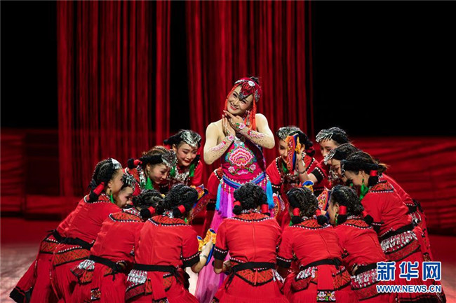 演員在音樂(lè)舞劇《云繡彝裳》第四章節(jié)“紅妝似火”中表演(11月15日攝)。新華社記者胡超攝