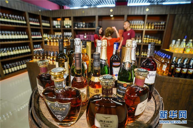 在中哈霍爾果斯國(guó)際邊境合作中心,游客在一家哈薩克斯坦酒商開(kāi)設(shè)的店鋪里選酒(7月11日攝)。新華社記者 趙戈 攝