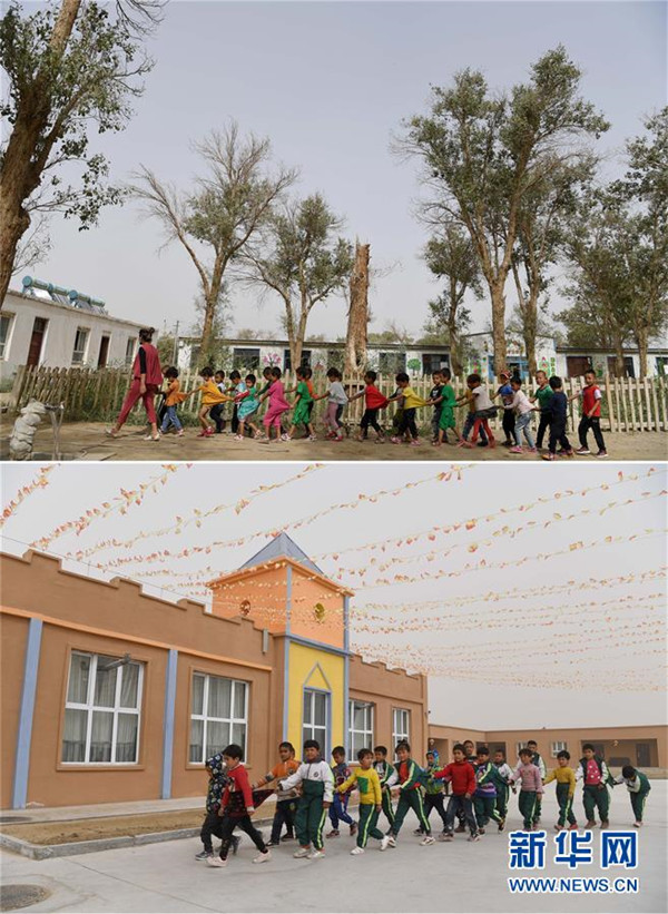 拼版照片:上圖為幼兒園學(xué)生走在易地扶貧搬遷前的于田縣達里雅布依鄉(xiāng)學(xué)校內(nèi)(2018年9月5日攝);下圖為幼兒園學(xué)生走在新校園內(nèi)(2019年3月20日攝)。