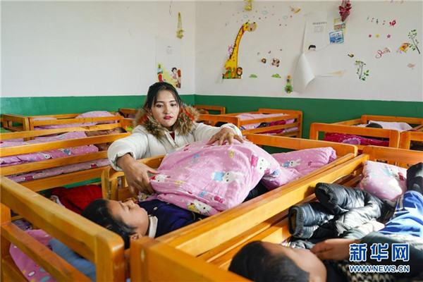 11月19日,在新疆于田縣達里雅布依鄉(xiāng)易地扶貧搬遷安置點的新幼兒園,老師依巴代提·買斯迪克在照顧中班的孩子們睡午覺。在該校位于塔克拉瑪干沙漠腹地的舊址,孩子們平時只能在大通鋪上休息,而在新校舍,每個孩子都有自己的木床睡。新華社記者沈伯韓攝