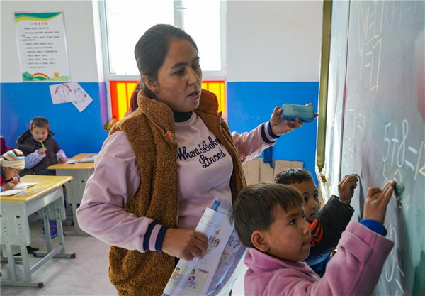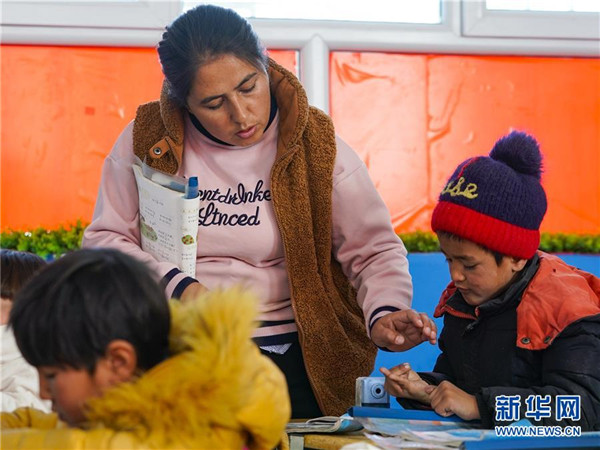 11月19日,在新疆于田縣達里雅布依鄉(xiāng)易地扶貧搬遷安置點的新學(xué)校,數(shù)學(xué)老師艾比拜木·吾布力艾山(中)在輔導(dǎo)一年級學(xué)生做計算題。新華社記者沈伯韓攝