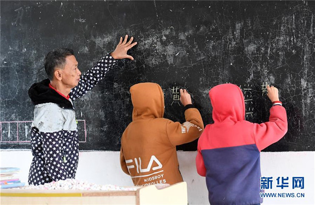 11月19日,在廣西上思縣那琴鄉(xiāng)中心小學逢通村教學點,梁志雄教兩名學生寫字。新華社記者陸波岸攝