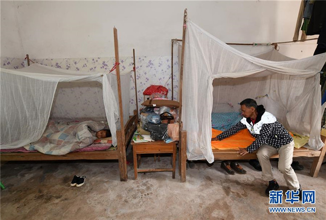 11月19日,在廣西上思縣那琴鄉(xiāng)中心小學逢通村教學點,梁志雄在鋪自己的床鋪準備午休。這個房間是梁志雄的辦公室兼臥室。新華社記者陸波岸攝
