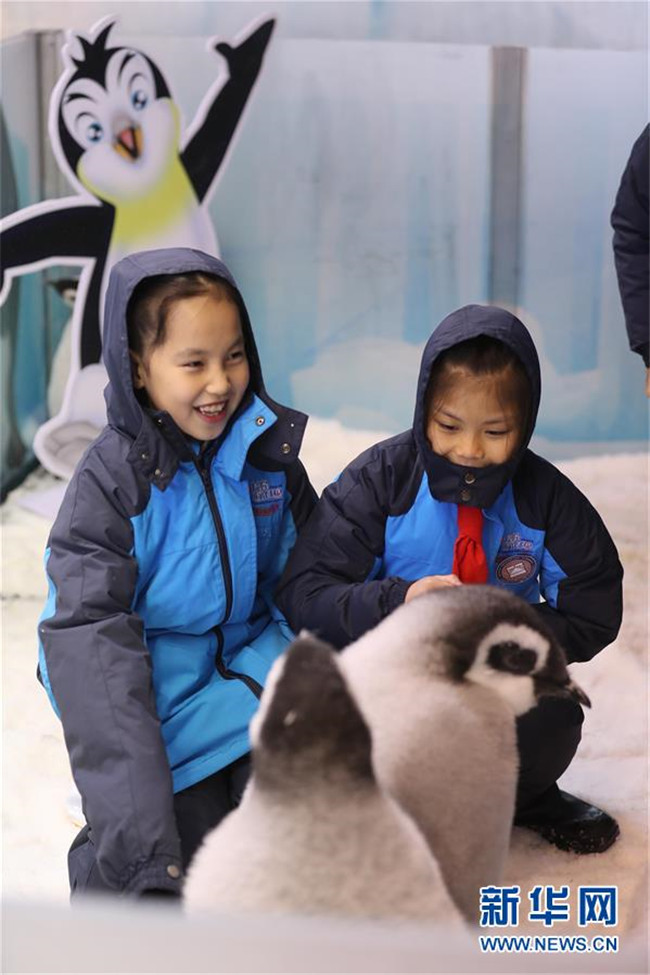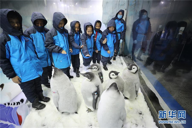 當日,來自廣州和珠海的小學生代表來到珠海長隆海洋王國,參加企鵝關愛活動,零距離接觸今年新生的帝企鵝。本次活動旨在加強極地科普教育,提高小學生保護動物和呵護極地的意識。 新華社記者 盧燁 攝