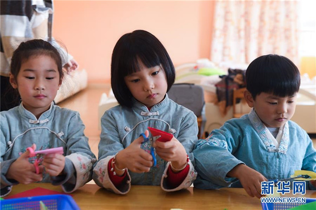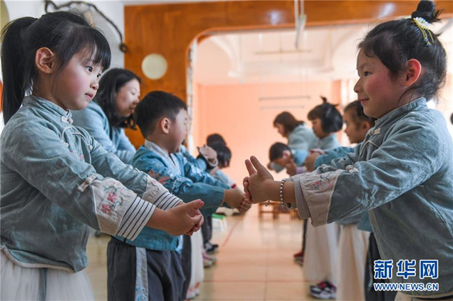 從2019年初開始,浙江省湖州市南太湖幼兒園開啟“國(guó)學(xué)課堂”,通過(guò)設(shè)立傳統(tǒng)禮儀、書法、剪紙、京劇、皮影戲等國(guó)學(xué)傳統(tǒng)文化課程,致力于將國(guó)學(xué)經(jīng)典教育滲透到幼兒日常生活學(xué)習(xí)中,培養(yǎng)幼兒的古典文化底蘊(yùn),教育幼兒從小培養(yǎng)良好的禮儀行為,讓幼兒們?cè)趥鹘y(tǒng)國(guó)學(xué)文化的滋養(yǎng)中成長(zhǎng)。 新華社記者 徐昱 攝