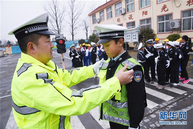 12月1日,東皋埠小學“小小交警隊”隊員們在安全教育活動中整理“警容”。新華社記者 李紫恒攝