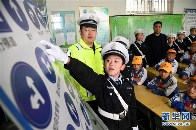 12月1日,東皋埠小學“小小交警隊”王嘉瑞(前)在為同學們介紹交通標識。新華社記者 李紫恒攝