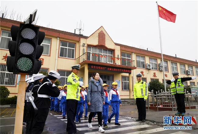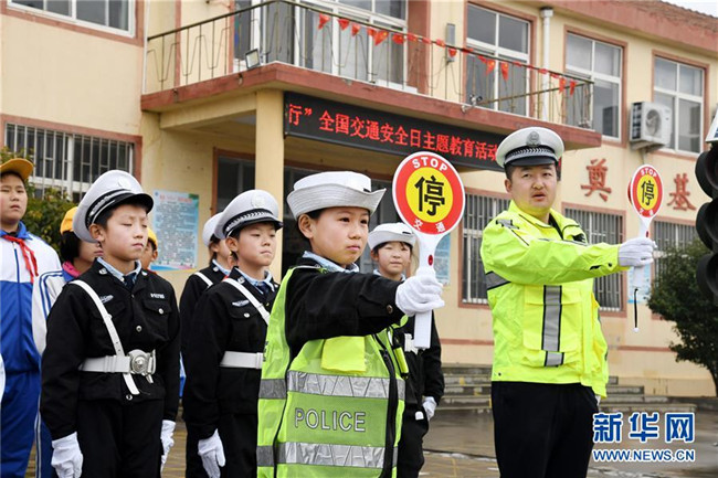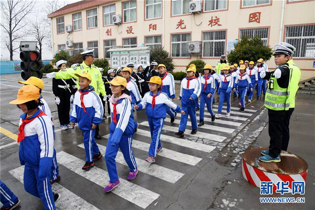 12月1日,東皋埠小學“小交警”在引導(dǎo)同學們安全通過“斑馬線”。新華社記者 李紫恒攝
