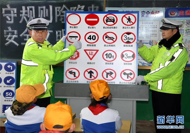 12月1日,民警劉澤春(左)在為東皋埠小學同學講解交通安全知識。新華社記者 李紫恒攝
