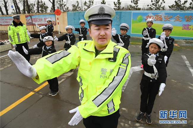 12月1日,東皋埠小學“小小交警隊”的隊員在學習交通指揮手勢。 新華社記者 李紫恒攝