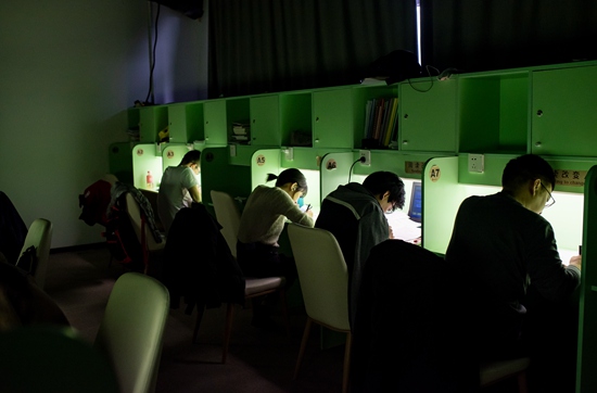 11月22日,北京中關(guān)村一家付費(fèi)自習(xí)室內(nèi),顧客在“暗室”中學(xué)習(xí)。正值考研季,付費(fèi)自習(xí)室里的多數(shù)顧客都是為考研而來。