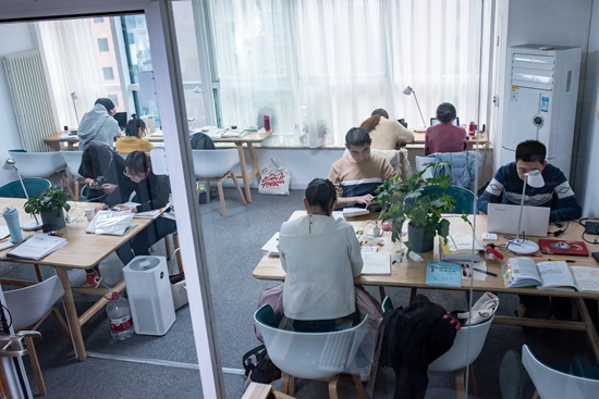 11月23日下午,北京青年路一家自習(xí)室一樓的開放區(qū),不少顧客在學(xué)習(xí)。下午往往是付費(fèi)自習(xí)室顧客最多的時候。
