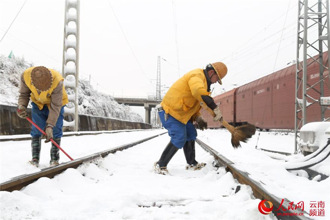 12月5日,云南省滇東北迎來今年以來首場降雪。昆鐵曲靖工務(wù)段及時啟動大雪天氣應(yīng)急預(yù)案,成立除雪打冰隊(duì),加強(qiáng)道岔除雪除冰工作。攝影:楊永全