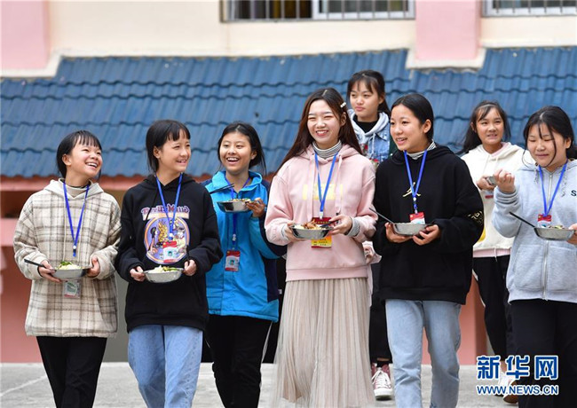 12月5日,在廣西融水苗族自治縣?;钢袑W(xué),林洋港(左四)和學(xué)生們從食堂打飯出來。林洋港是西北工業(yè)大學(xué)的在讀碩士研究生,今年9月來到融水苗族自治縣?;钢袑W(xué)任物理老師。新華社記者 黃孝邦 攝