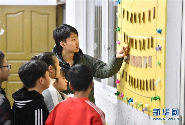 12月5日,在廣西融水苗族自治縣民族中學(xué),郭浩坤在教室里看同學(xué)們的心愿卡。郭浩坤是西北工業(yè)大學(xué)的在讀碩士研究生,今年9月來到融水苗族自治縣民族中學(xué),擔(dān)任物理老師。 新華社記者 黃孝邦 攝