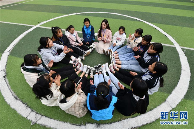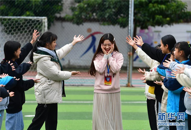 12月5日,在廣西融水苗族自治縣保桓中學(xué),林洋港(右三)和學(xué)生們?cè)谇驁?chǎng)上玩游戲。林洋港是西北工業(yè)大學(xué)的在讀碩士研究生,今年9月來到融水苗族自治縣保桓中學(xué)任物理老師。新華社記者 黃孝邦 攝