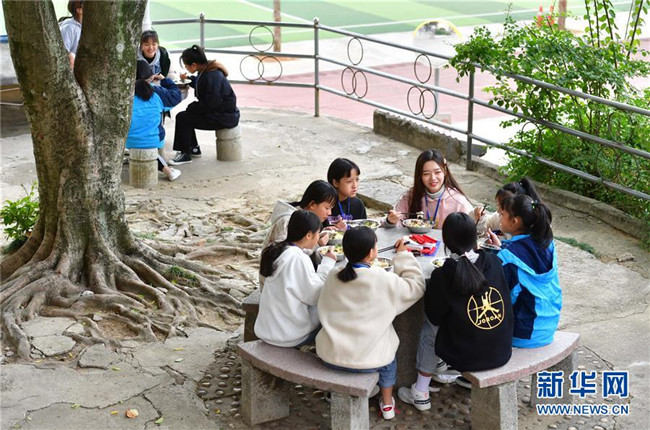 12月5日,在廣西融水苗族自治縣?;钢袑W(xué),林洋港(正面,右一)和學(xué)生們?cè)谛@里吃午飯。林洋港是西北工業(yè)大學(xué)的在讀碩士研究生,今年9月來到融水苗族自治縣保桓中學(xué)任物理老師。 新華社記者 黃孝邦 攝