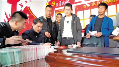 執(zhí)法人員現(xiàn)場為李斌等農(nóng)民工發(fā)放追回的工資。本報(bào)記者 馬照剛 攝