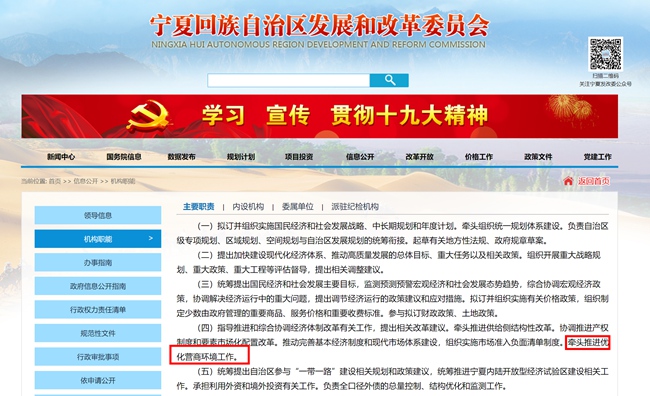在自治區(qū)發(fā)改委官方網(wǎng)站上,其機(jī)構(gòu)職能中主要職責(zé)提到負(fù)責(zé)牽頭推進(jìn)優(yōu)化營商環(huán)境工作。(網(wǎng)頁截圖)