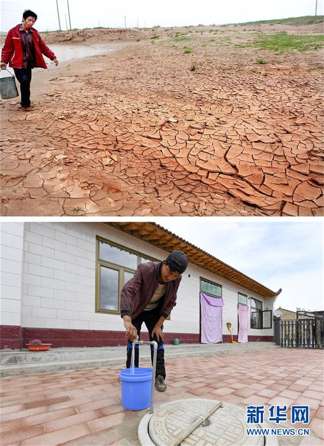 拼版照片:上圖為寧夏同心縣預(yù)旺鎮(zhèn)村民趙海江在北旺水庫取水(新華社記者李紫恒2006年8月13日攝);