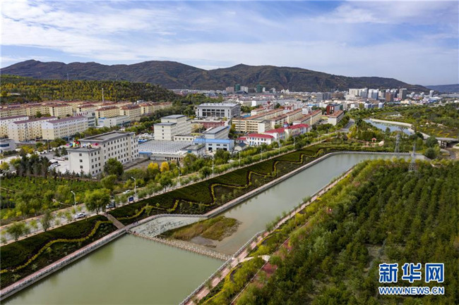 寧夏固原市隆德縣境內(nèi)的渝河兩岸健身步道、綠化景觀等設(shè)施完善,成為居民休閑娛樂的好去處(10月11日無人機(jī)拍攝)。  新華社記者 馮開華 攝