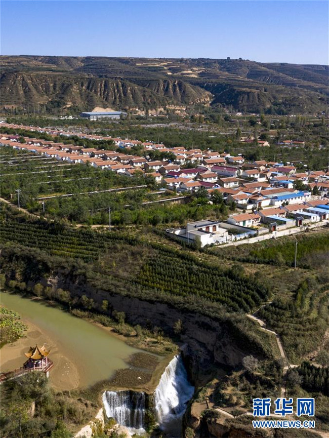 流經(jīng)寧夏固原市彭陽縣城陽鄉(xiāng)的茹河,因地殼變化和河床運(yùn)動形成旱塬上的瀑布,當(dāng)?shù)匾源税l(fā)展鄉(xiāng)村旅游(10月12日無人機(jī)拍攝)。  新華社記者 馮開華 攝