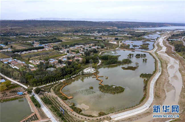 經(jīng)過綜合治理后的茹河成為寧夏固原市彭陽縣的一道新風(fēng)景(10月12日無人機(jī)拍攝)。 新華社記者 馮開華 攝