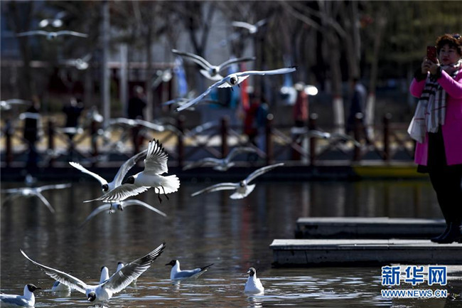 紅嘴鷗在寧夏銀川市燕鴿湖公園覓食(3月21日攝)。  新華社記者 馮開華 攝