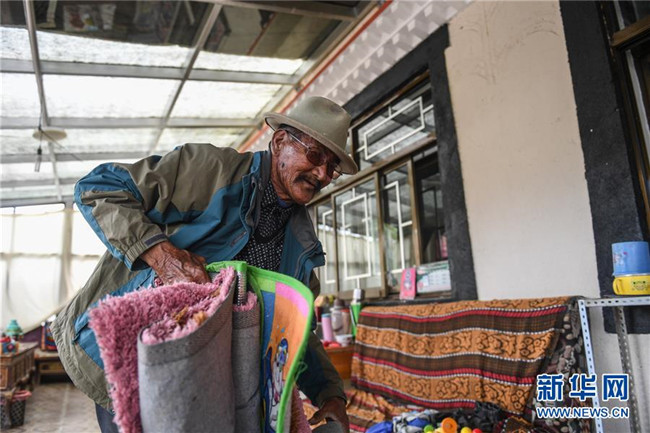 在西藏阿里地區(qū)札達縣托林鎮(zhèn)札布讓村,76歲的達瓦次仁在整理家庭旅館的床墊(7月30日攝)。 新華社記者 晉美多吉 攝
