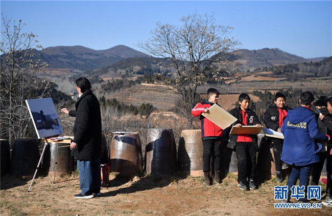 一名藝術(shù)家(左一)和洛寧縣羅嶺鄉(xiāng)初級中學(xué)的學(xué)生們在洛寧縣前河村進(jìn)行繪畫創(chuàng)作(12月29日攝)。新華社記者 李嘉南 攝