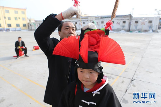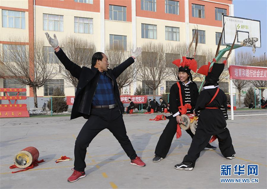 1月9日,在甘肅省武威市涼州區(qū)四壩鎮(zhèn)九年制學(xué)校,攻鼓子指導(dǎo)老師楊萬航(左)為學(xué)生示范動(dòng)作。