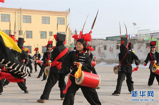 攻鼓子是發(fā)源于甘肅武威的一種民間鼓樂舞蹈,表演風(fēng)格渾厚豪邁、威武雄壯,具有強(qiáng)烈的地域特色。2008年,涼州攻鼓子被列為第二批國家級(jí)非物質(zhì)文化遺產(chǎn)。為更好地傳承這項(xiàng)非物質(zhì)文化遺產(chǎn),甘肅省武威市涼州區(qū)四壩鎮(zhèn)九年制學(xué)校組建攻鼓子藝術(shù)社團(tuán),開設(shè)攻鼓子校本課,定期由當(dāng)?shù)毓ス淖哟硇詡鞒腥藢W(xué)生進(jìn)行指導(dǎo),推動(dòng)“非遺”攻鼓子藝術(shù)教育普及。 新華社記者 耿馨寧 攝