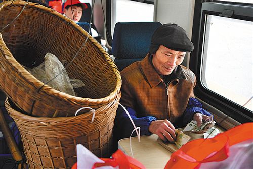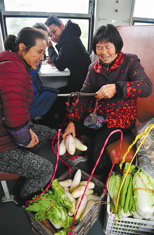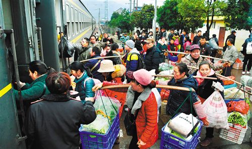 ▲??吭诤鲜÷殛柟赫镜?272次列車,當(dāng)?shù)毓r(nóng)菜農(nóng)挑著擔(dān)子準(zhǔn)備上車。這趟“慢火車”所經(jīng)過的地區(qū)多為“老少邊窮”,經(jīng)濟(jì)欠發(fā)達(dá)。為盤活沿途百姓致富渠道,鐵路部門開“綠燈”允許乘客攜帶大量鮮活貨物乘車。