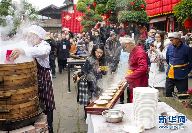 1月18日,在中山古鎮(zhèn)的“千米長(zhǎng)宴”上,民間藝人用古鎮(zhèn)傳統(tǒng)“打盆”絕藝給游客們上菜。當(dāng)日中午,伴隨著一聲“開(kāi)席嘍”,一年一度的“千米長(zhǎng)宴”在重慶市江津區(qū)中山古鎮(zhèn)舉行。噴香的煙熏豆腐、軟糯的夾燒肉、可口的石板糍粑……800余桌年味十足的特色美食,吸引了兩萬(wàn)多名游客前來(lái)體驗(yàn)傳統(tǒng)民俗,感受“一雙筷子吃遍一條街”的暢快淋漓。中山古鎮(zhèn)自古就有“千米匯長(zhǎng)宴萬(wàn)人祈福祉”的習(xí)俗。每年春節(jié)期間,古鎮(zhèn)老街居民都會(huì)在千米長(zhǎng)街上大擺“百家宴”,祝福生意興隆、家業(yè)興旺、風(fēng)調(diào)雨順、五谷豐登。新華社記者劉潺攝