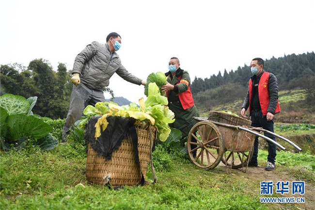 2月8日,菜農(nóng)(左)和鄉(xiāng)村蔬菜配送小隊(duì)志愿者在地里采收蔬菜。新華社記者 唐奕 攝