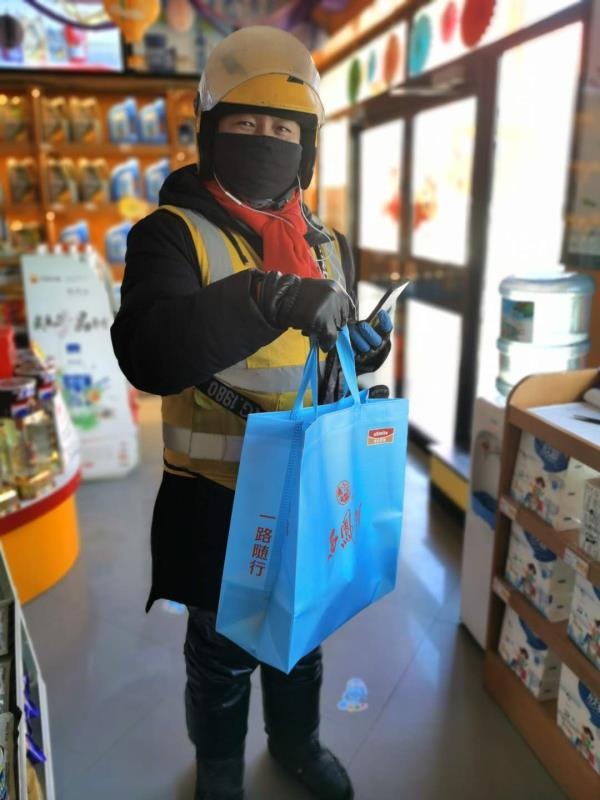 榆陽佳能加油站員工霍靜迅速拿起手機(jī)確認(rèn)訂單,欣喜若狂,將商品依次消毒放入昆侖好客打包袋等待快遞小哥取單。因?yàn)槭巧暇€的第一單,特意在打包袋里面裝有溫馨提示小紙條:“戴口罩、勤洗手,中國(guó)加油!武漢加油!中國(guó)石油與您同在!”