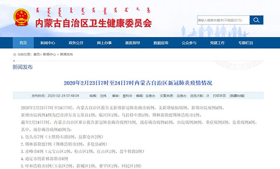 截至2月24日7時(shí),內(nèi)蒙古自治區(qū)累計(jì)報(bào)告新冠肺炎確診病例75例, 現(xiàn)存確診病例45例,出院病例30例,重癥病例3例,危重病例4例。