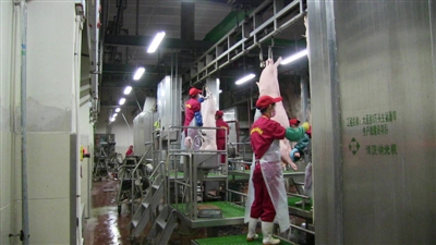 圖為鑫興源公司工作人員正在進(jìn)行加工肉制品。