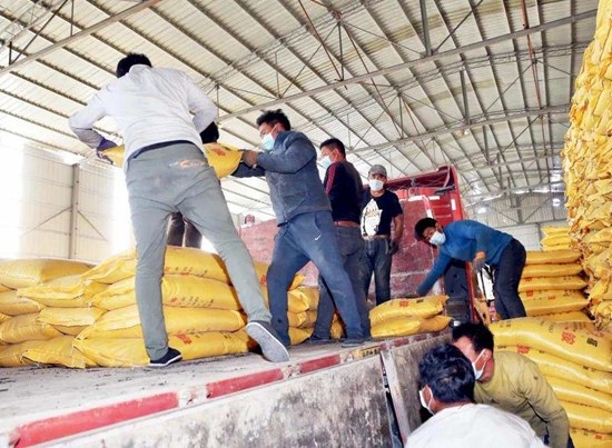 西藏農(nóng)投集團(tuán)化肥倉庫現(xiàn)有庫存2萬多噸化肥,工人們正在忙碌搬運(yùn)。西藏日?qǐng)?bào)記者 姚海全 攝