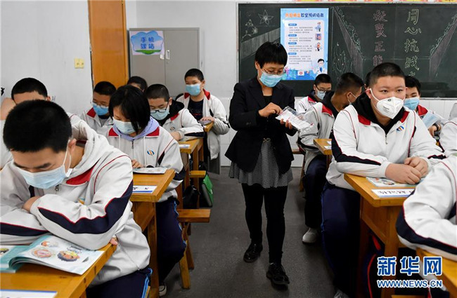 4月7日,西安匯知中學初三畢業(yè)班的老師向學生發(fā)放口罩。