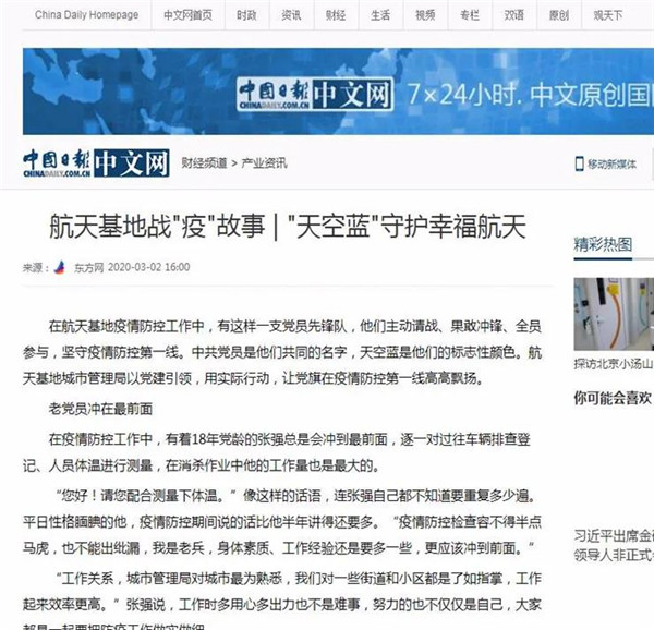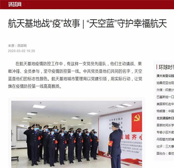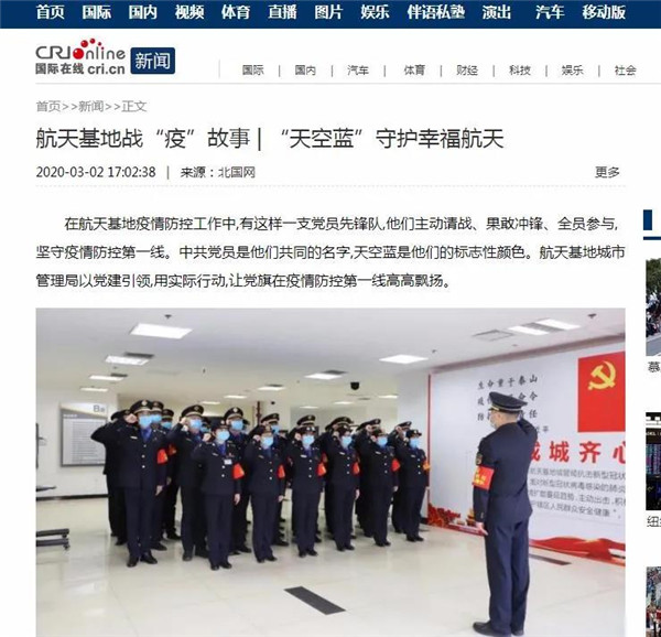 3月2日,航天基地《“天空藍”守護幸福航天》,講述了擁有18年黨齡的張強、退役士官魏斌、工作人緣好李鵬飛用行動展現(xiàn)共產(chǎn)黨人政治本色的積極實踐。國際在線、中國日報網(wǎng)、環(huán)球網(wǎng)、鳳凰網(wǎng)、西部網(wǎng)、三秦網(wǎng)、搜狐等近20家中央、省級、市級網(wǎng)絡(luò)媒體轉(zhuǎn)發(fā),網(wǎng)友產(chǎn)生強烈共鳴。