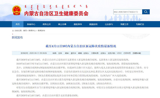 2020年4月10日7時(shí)至4月11日9時(shí),內(nèi)蒙古自治區(qū)報(bào)告新增境外輸入新冠肺炎確診病例27例、疑似病例1例。排除疑似病例8例。
