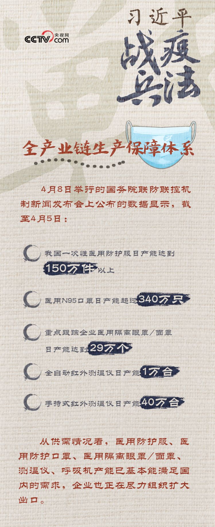 截至4月2日,國務(wù)院聯(lián)防聯(lián)控機制醫(yī)療物資保障組累計為湖北等地區(qū)調(diào)撥了醫(yī)用防護服超過800余萬件,醫(yī)用隔離面罩(眼罩)165萬個,免洗手消毒液357噸,手持紅外測溫儀66萬臺,負壓救護車1000余輛,呼吸機等醫(yī)療救治設(shè)備超過了7萬臺套。