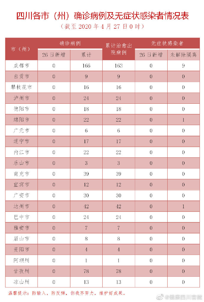 記者從四川省衛(wèi)健委獲悉,4月26日0-24時,四川無新增新型冠狀病毒肺炎確診病例,無新增疑似病例,157人尚在接受醫(yī)學(xué)觀察。